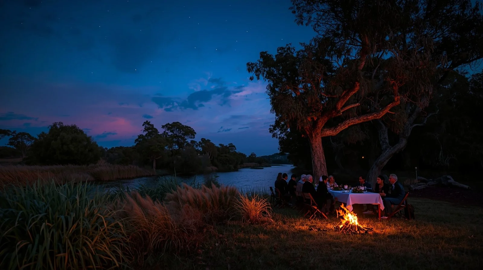 PROMPT: Dusk falls on a summer evening in Wonnarua Country in the Hunter Valley, 2040, with river she-oak, river red gum, and native grasses quandong, midyim berry, and kangaroo apple, set against the serene Coquun River. The sky transforms into a deep blue canvas with subtle pink clouds and early evening stars. In the distance, a community circle gathers around a warm biochar fire, silhouetted against the golden flames, with faces hidden, comprising people of all ages and diverse backgrounds. An elder shares a story as a child leans in, intrigued, near a long dinner table adorned with a white tablecloth, laden with home-grown delicacies like quandong tarts, kangaroo apple salad, and midyim berry wine. The scene is bathed in cinematic photorealism, with high dynamic range, ultra-realistic 8K detail.