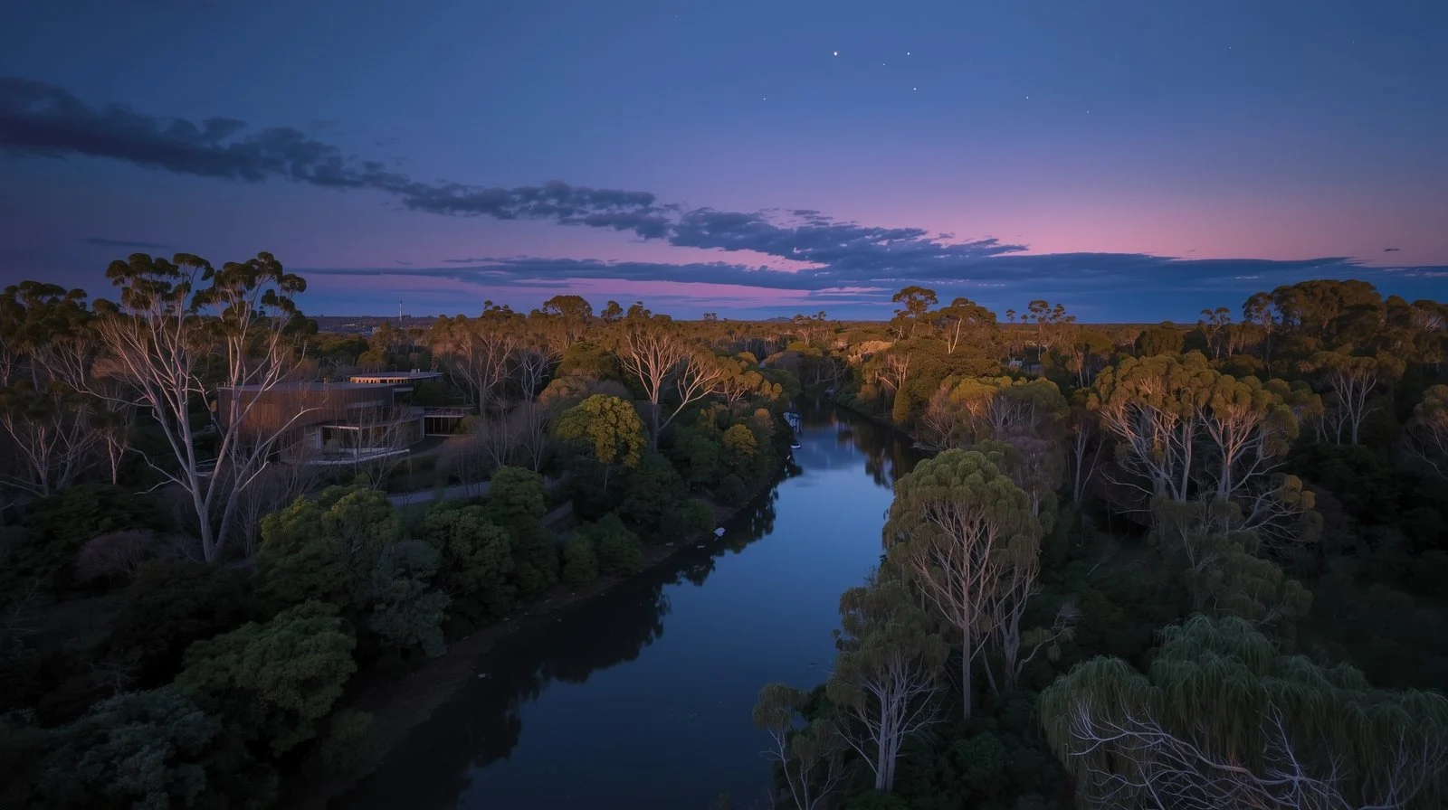 PROMPT: A view of the Yarra River through Morton Bay Figs, River red gums and yellow box, a deep blue dawn sky overlooking a regenerated Melbourne, 2040. A couple of low rise buildings are integrated within the landscape. The scene feels abundant, ecologically coherent, and quietly joyful. Cinematic photorealism, golden hour light through eucalyptus canopy, high dynamic range, ultra-realistic, 8K detail.