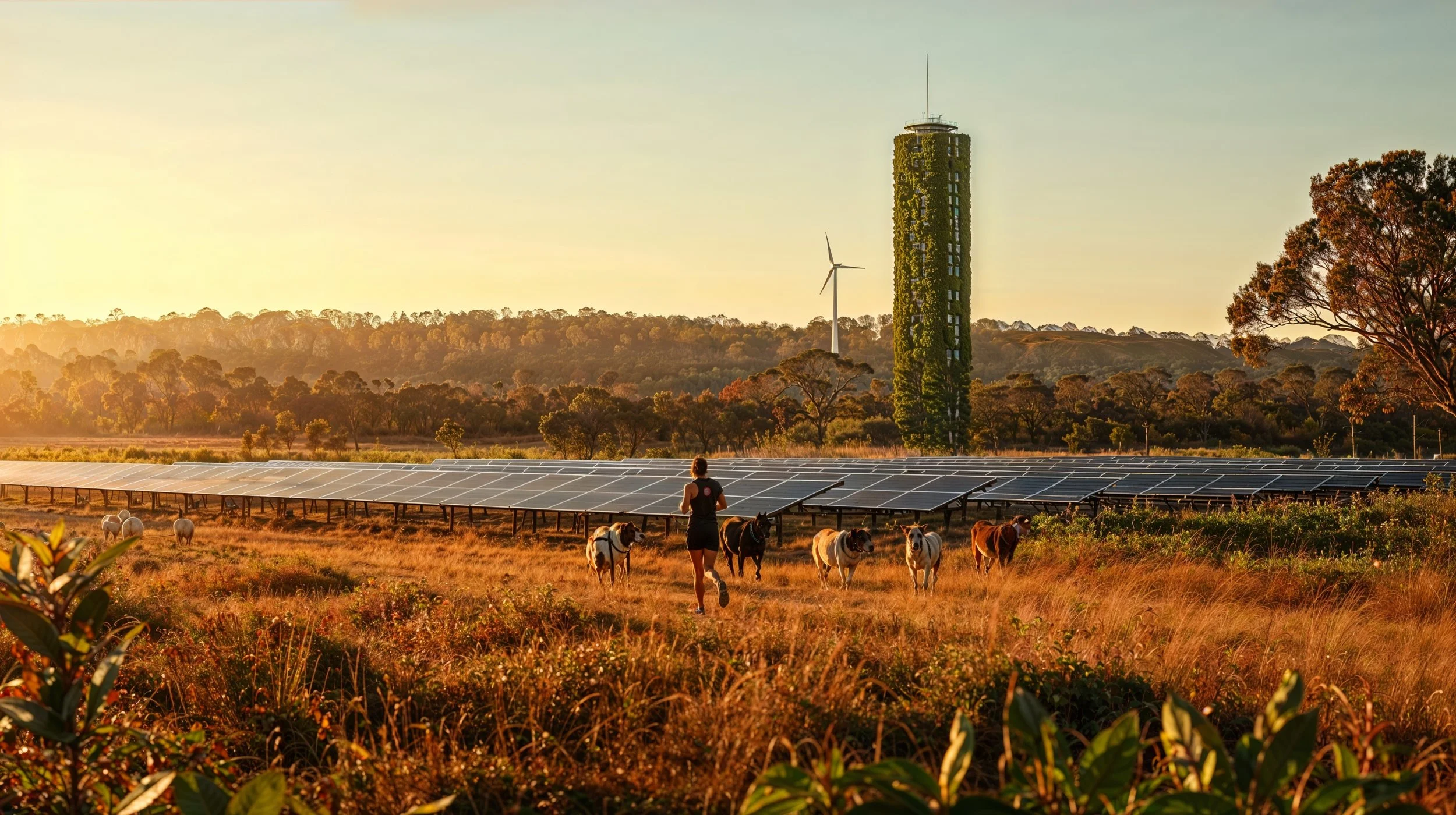 PROMPT: A dawn run on Gunaikurnai Country in East Gippsland, 2040. A woman jogs at first light past a paddock of gently grazing cattle and sheep beneath a sea of solar panels — the animals calm, the land sequestering carbon. Manna gum and mountain ash rise at the paddock's edge. Further along, a skyscraper is visible with air-purifying plants growing from its exterior. A native forest plantation stretches to the horizon, with a single wind turbine above the treeline. The air is hot but clear. Cinematic photorealism, golden dawn light, high dynamic range, ultra-realistic, 8K detail.