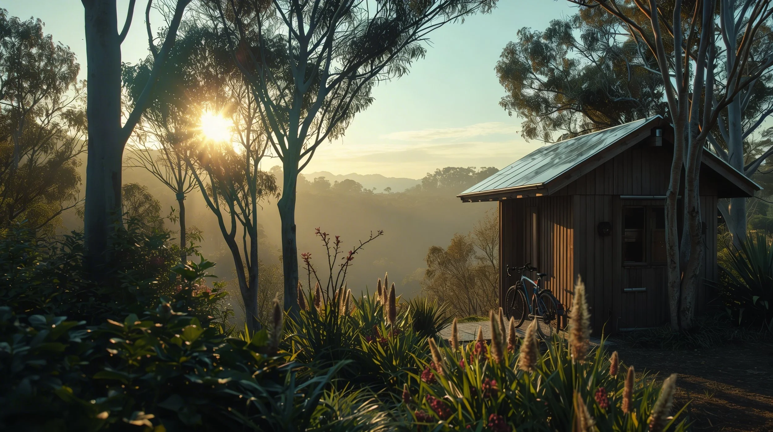 PROMPT: A lush native food garden on Ngunnawal Country, what was once called Canberra, 2040. The early morning sun is already hot, and translucent solar panels filter dappled light over mixed crops and native food plants. Snow gums and ribbon gums provide shade at the garden's edge. At the garden's far end, a small bettong explores the mulch. A bike is propped against a timber shed. The ACT ranges are visible beyond, hazy with eucalyptus oil. Cinematic photorealism, early morning hazy golden light, high dynamic range, ultra-realistic, 8K detail.
