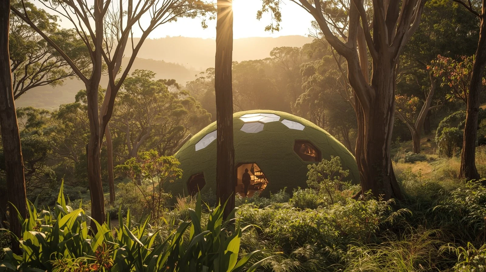 PROMPT: The view through towering mountain ash, messmate, and manna gum trees of a natively grass-roofed earthship dome home nestled in the forested hills of the Yarra Ranges near Healesville, 2040, translucent hexagonal solar panels embedded elegantly in the natively grassed dome roof, bathed in misty golden morning light, inside the silhouette of a person seen from behind is visible through a small hexagonal window, the light from a warm fire glowing in the background, surrounded by a permaculture garden filled with vibrant vegetables and native food plants like native raspberry, warrigal greens, and lemon myrtle, set against the backdrop of forested hills extending to the horizon, with mountain ash and blue gum trees forming a regenerated bio-corridor, as kookaburras call, in cinematic photorealism with high dynamic range and ultra-realistic 8K detail.